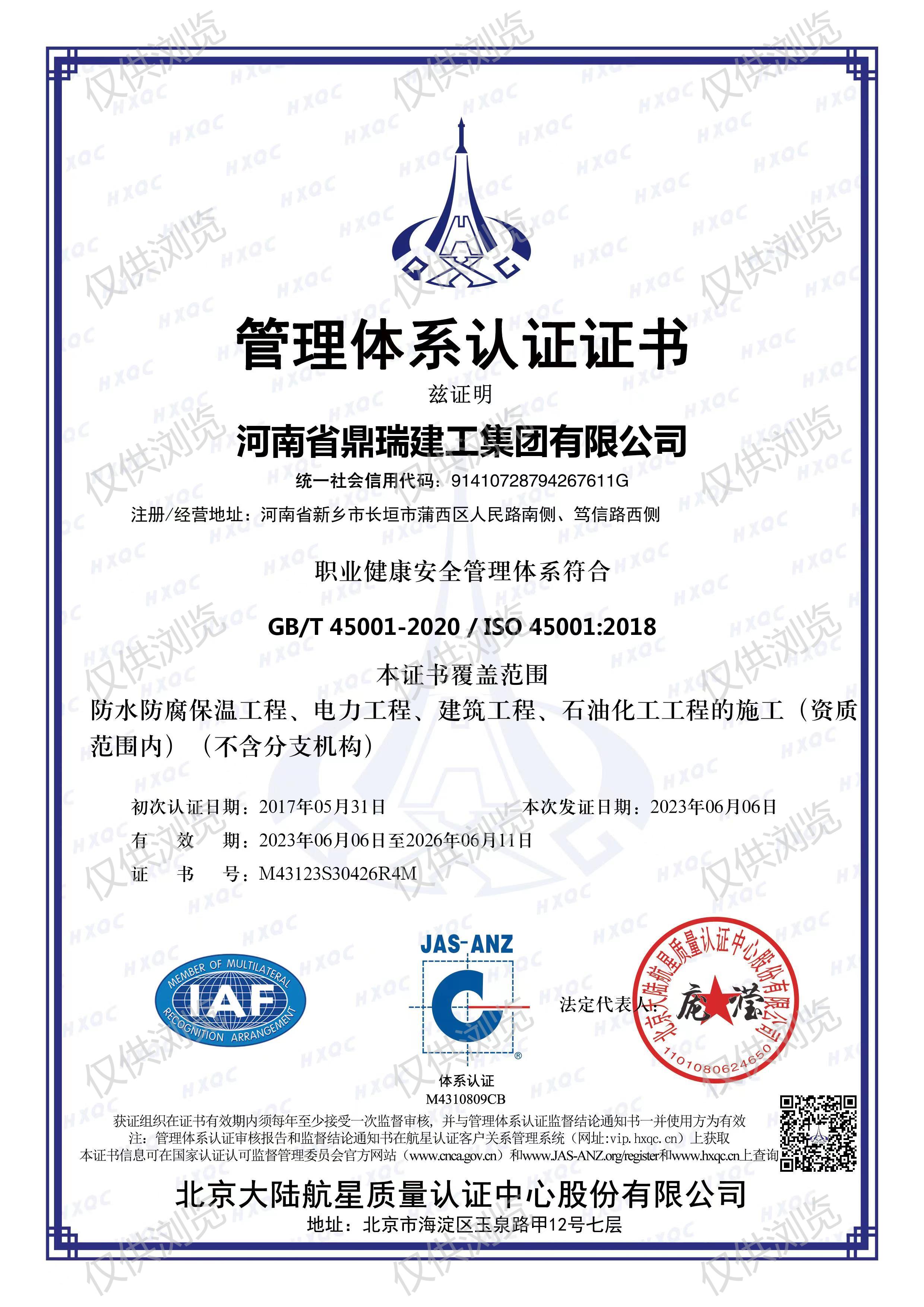 職業健康安全管理體系認證證書